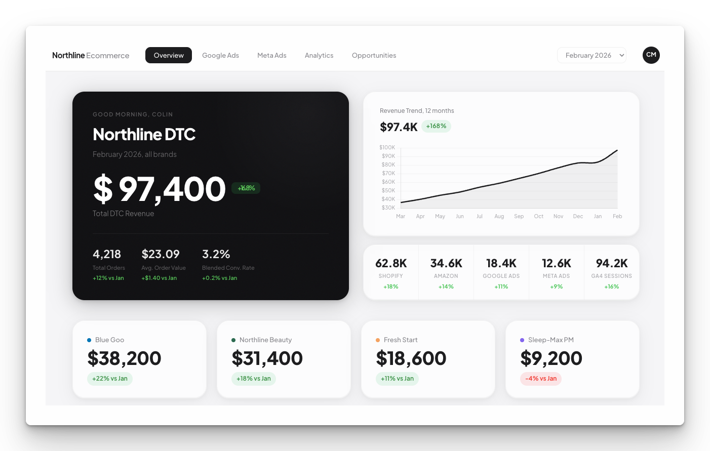 Client-facing reporting portal with per-client logins, pulling live data from Semrush, GA4, PPC platforms, and Local Dominator. White-label ready, built to replace Looker Studio or other reporting platforms