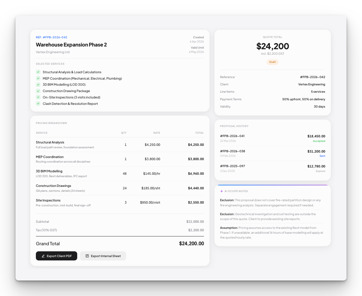 Proposal tool that generates formatted quotes from checkbox selections. Dynamic pricing, auto-generated deliverables, AI scope exclusions. What used to take 45 minutes takes seconds.
